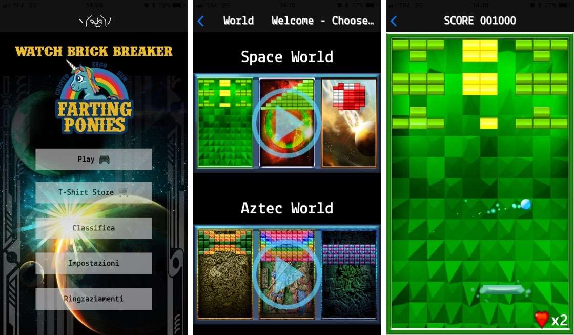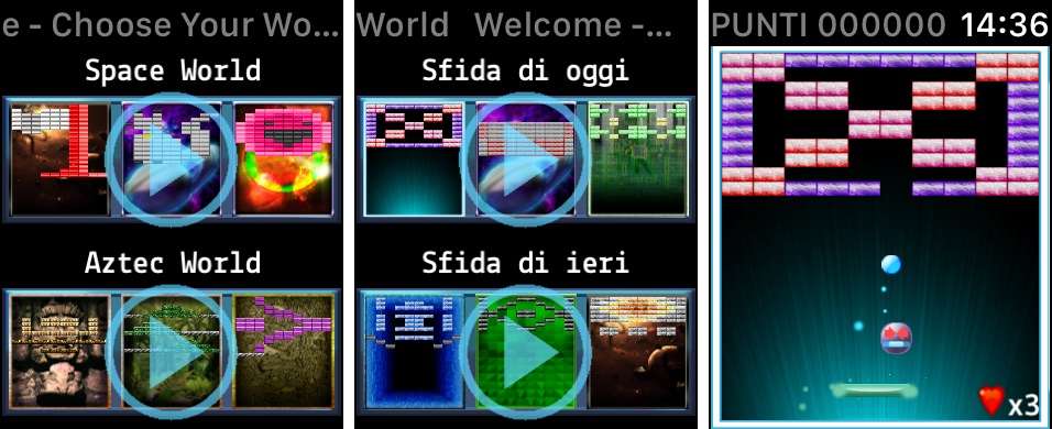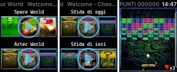 Nello specifico di Watch Brick Breaker e di Apple Watch, il controllo della barra avviene attraverso la corona dell’orologio, e gli schemi di gioco sono molto vari sia dal punto di vista grafico che da quello della difficoltà: al lancio dell’applicazione si dovrà scegliere se giocare in un ambientazione con grafica spaziale o con un tema che richiama gli antichi aztechi . Dopodiché di deve scegliere se affrontare la sfida dei tre schemi odierni, o di quelli del giorno precedente, perché una cosa bella di Watch Brick Breaker è la continua variazione degli schemi di gioco, che ne offre continuamente di nuovi, e permette di confrontare il proprio risultato con quelli di tutti gli altri giocatori che hanno caricato il proprio punteggio online.