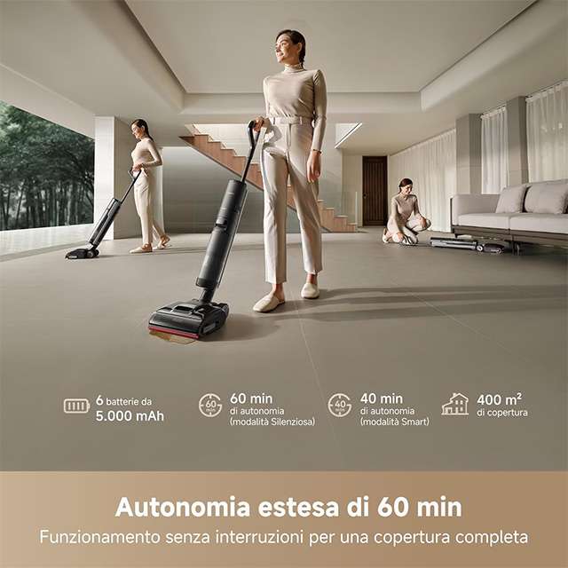 Ha in dotazione il braccio robotico GapFree AI DescendReach per una copertura su tre lati, raggiungendo anche gli angoli più ostici e passando agevolmente sotto i mobili, sfruttando il al design ultra piatto a 180 gradi. ancora, il sistema TangleCut con raschietto flessibile evita i grovigli di capelli e peli, migliorando l’efficienza e riducendo la necessità di manutenzione. La base con pulizia automatica rende la spazzola sempre igienizzata: viene immersa in acqua calda a 100 °C, strizzata con movimenti alternati e asciugata da aria calda a 90 °C. Inoltre, come si legge nella scheda tecnica, l’aspirazione potente da 21 kPa, unita al sistema motorizzato GlideWheel e alla batteria con autonomia fino a 60 minuti, rendono il prodotto un top di gamma senza compromessi. C’è anche il controllo intelligente tramite app per personalizzare la modalità di funzionamento.