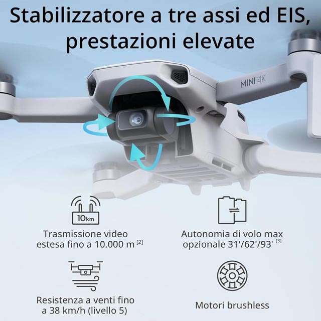 Come suggerisce il nome ha in dotazione un sensore in grado di effettuare registrazioni in formato 4K a 30 fps. Tra le altre caratteristiche che vale la pena segnalare ci sono lo stabilizzatore a tre assi, la trasmissione del segnale video fino a 10 Km di distanza, il ritorno automatico al punto di partenza, la resistenza a venti fino a 38 Km/h, l’autonomia di 31 minuti della batteria e il peso inferiore a 249 grammi che lo inserisce nella classe 0 (si può volare senza sostenere alcun test). Nella scheda completa trovi tutte le altre informazioni che cerchi.