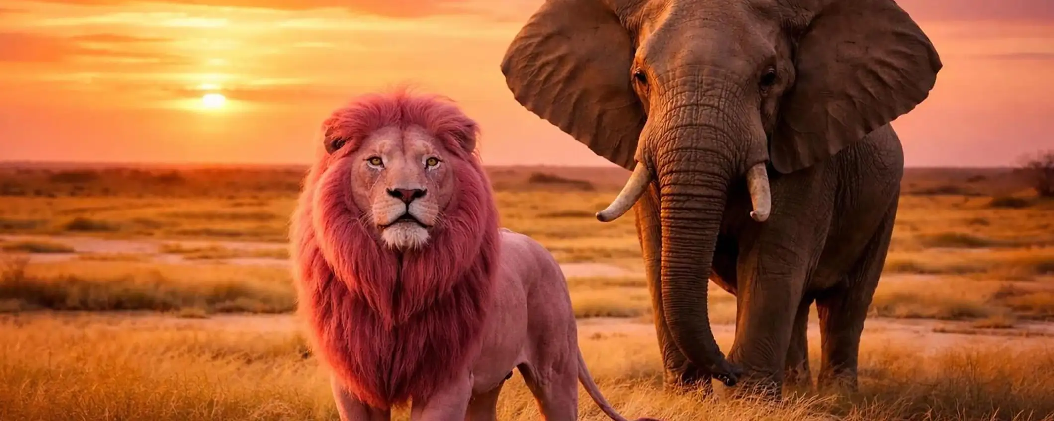 Troppo semplice, quasi banale? Ok, proviamo a spingerci un po’ più in là con la fantasia. Vediamo cosa succede con il prompt Sostituisci la zebra di sinistra con un leone rosa e metti il personaggio Dhalsim di Street Fighter sulla schiena dell’elefante, cambia il cielo in un tramonto