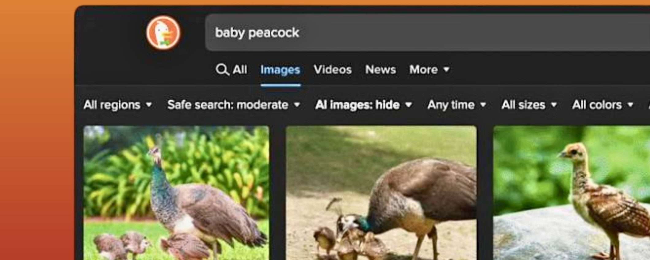 Non è un caso che DuckDuckGo abbia usato come esempio la ricerca di un cucciolo di pavone. È un riferimento diretto al controverso caso di Google dell’anno scorso, quando cercando immagini del volatile si ottenevano principalmente risultati generati dall’AI invece di foto reali.