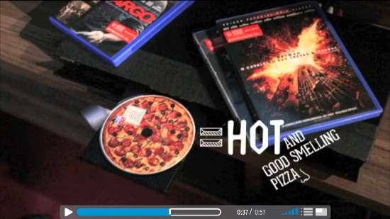 Inoltre, a fine film, quando il DVD viene rimosso dal lettore, la sua cover appare agli occhi dei clienti disegnata a forma di pizza con un succulento messaggio pubblicitario: “Ti è piaciuto il film? La prossima volta rendilo migliore, gustando una calda e appetitosa Domino’s Pizza”.
