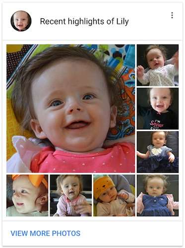 Allo stesso modo , quando il sistema si rende conto che ci sono molti scatti recenti dedicati allo stesso soggetto, potrebbe decidere di tanto in tanto di presentarli raggruppati una sola scheda: questi “highlight” sono particolarmente utili per esempio per le foto scattate ai bambini, così da poterle classificare facilmente e magari ripescarle anno per anno per mostrare ad amici e parenti come crescono i pargoli.