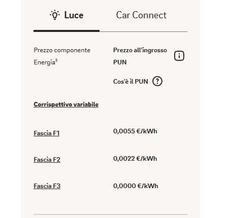 L’offerta, come vedi dall’immagine qui sopra, è indicizzata al mercato all’ingrosso: sfruttando la struttura a fasce, paghi l’energia al prezzo di mercato puro nelle ore serali, notturne e nei festivi, risultando come i momenti ideali per lasciare l’auto in carica.