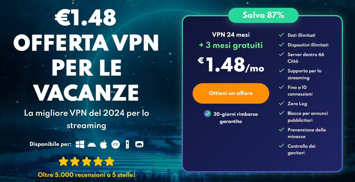 Per finire, parliamo nuovamente dell’offerta promozionale: tre mesi gratuiti aggiuntivi quando attivi l’offerta biennale. Per dirla in termini semplici, si tratta di 27 mesi di tranquillità durante la navigazione online a soli 1,48 euro al mese. Privado VPN è decisamente la VPN perfetta per le vacanze, il download, lo streaming e, perché no, anche il gaming.