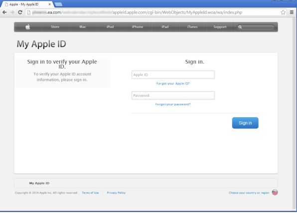 Queste sono state utilizzate per ospitare le pagine di un sito che ricalcava quelli di Apple : puntava ad ingannare gli utenti della Mela, cercando di ottenerne le credenziali di accesso Apple ID per poi rispedirli alle pagine legittime di Apple in modo tale da non destare sospetti.