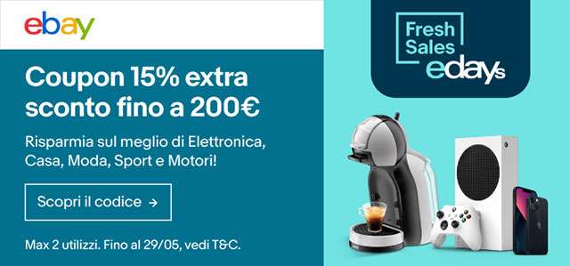 Chiudiamo riepilogando le informazioni più importanti sulla promozione lanciata oggi da eBay e che mette a disposizione il coupon per ottenere il 15% di sconto, rimandando alla pagina dedicata sul sito ufficiale per tutti gli altri dettagli.