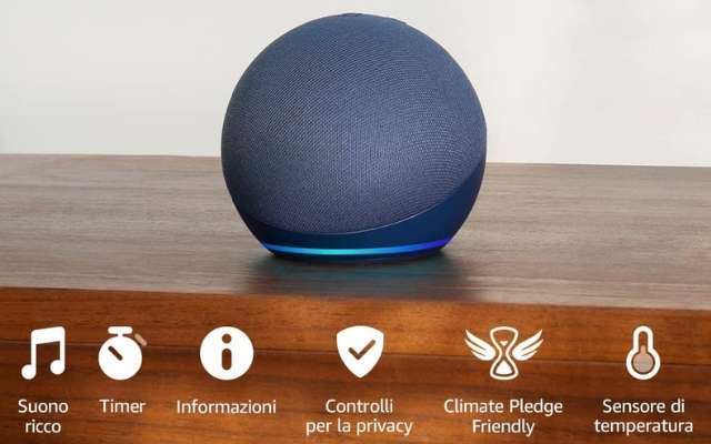Con Echo Dot 5 Blu Notte hai un assistente vocale sempre a tua disposizione. Con Alexa integrata puoi chiedere tutte le informazioni che vuoi ricevendole in tempo reale. Ancora più evoluto, questo nuovo modello ha anche un sensore di temperatura integrato nella scocca. Riproduce la tua musica preferita, ti informa delle ultime notizie, ti ricorda il meteo della giornata, ti sveglia il mattino e ti fa addormentare la sera. Inoltre, ti permette di gestire i dispositivi di Casa Intelligente.