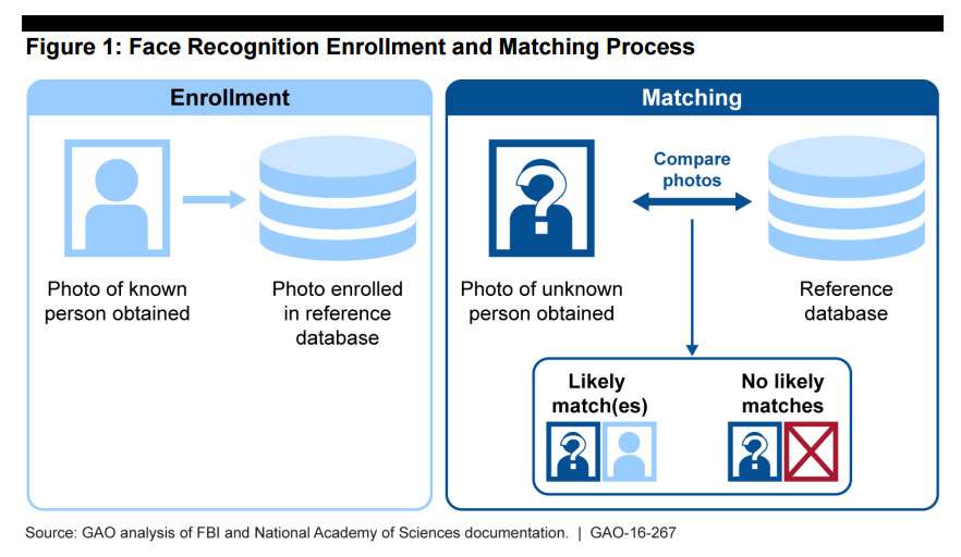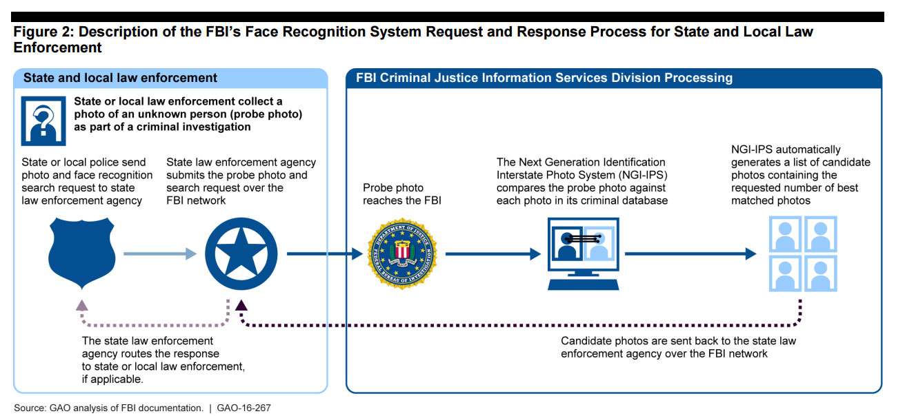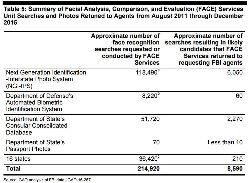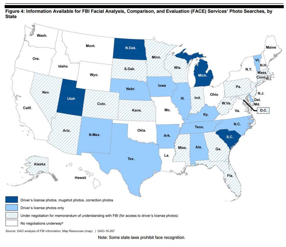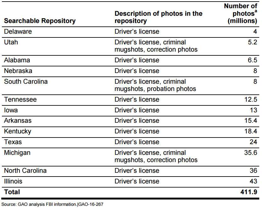 Secondo il rapporto, oltre ad avere accesso all’enorme database NGI, l’FBI è in possesso di decine di milioni di fotografie, tra civili e criminali, e attraverso l’unità Facial Analysis, Comparison and Evaluation (FACE), alla banca dati del Dipartimento di Stato incaricato dei visti e dei passaporti, ai dati biometrici del Dipartimento della Difesa e alla banca dati delle patenti di guida rilasciate in almeno 16 stati. In totale il Bureau può accedere ad oltre 400 milioni di foto di cittadini americani e stranieri che non hanno commesso reati.