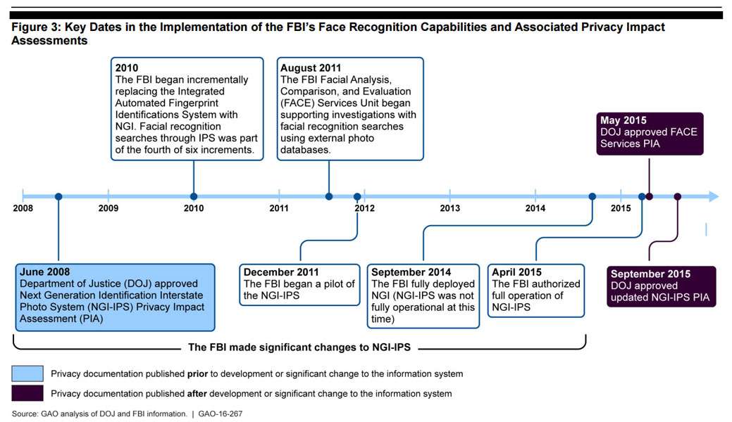 Dal 2010 l’FBI ha iniziato a sostituire gradualmente il sistema IAFIS con il Next Generation Identification (NGI), progettato per includere non solo i dati relativi alle impronte digitali IAFIS e biografici, ma anche dati biometrici avanzati, oltre ad essere dotato di un potente (ma non infallibile) sistema per il riconoscimento facciale. Il Bureau ha infatti aggiornato l’ Interstate Photo System (IPS) in maniera da ottenere un servizio di riconoscimento facciale che consenta alla polizia di cercare all’interno di un database di foto segnaletiche di criminali attraverso le impronte digitali. Il progetto pilota NGI-IPS, lanciato a dicembre del 2011, è diventato pienamente operativo nel mese di aprile 2015, secondo quanto asserito nel rapporto del GAO.