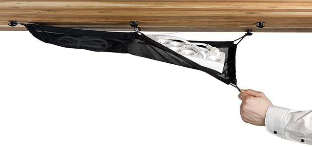 Piccole ventose in grado di suddividersi il peso, una rete elastica in grado di mantenere tutto aderente alla superficie inferiore del piano di lavoro ed una configurazione plastica con cui scegliere come raccogliere i cavi e conservarli. Ci si può mettere dentro un cavo passante, un cavo raccolto, una ciabatta, un trasformatore e qualunque altra cosa meriti di restare nascosto e al sicuro da colpi maldestri.