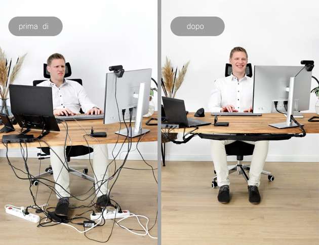 Non servono troppe parole per spiegare a cosa possa servire una rete portacavi sotto la scrivania: basta una semplice immagine.