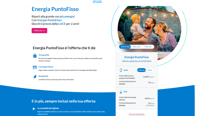 Energia PuntoFisso è quindi la proposta ideale per chi vuole partire con il piede giusto nella gestione delle utenze, unendo stabilità, convenienza e sostenibilità. Ma attenzione: l’offerta è valida solo fino a oggi, 24 settembre 2025. Per approfittarne basta andare sul sito di Engie e registrarsi direttamente da lì.