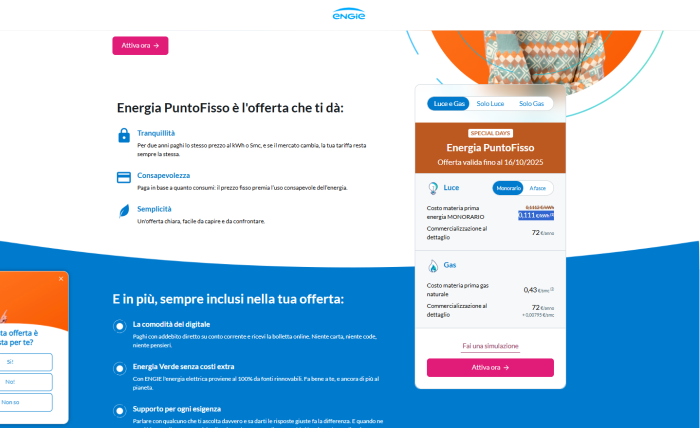 Questa promozione si chiama Energia PuntoFisso e scade oggi! C’è ancora tempo qualche ora per attivarla direttamente online. Ma come fare? Basta andare sul sito di Engie e attivare la fornitura direttamente da lì. E quali sono le tariffe previste in questo momento? Vediamolo nelle prossime righe.
