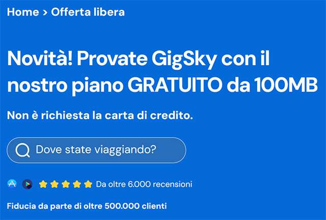 Non serve nemmeno la carta di credito: ottieni subito la tua eSIM con 100 MB di dati, grazie all’offerta di GigSky. Devi solo scegliere la destinazione del mondo in cui la utilizzerai, nient’altro. Deciderai poi con calma, una volta arrivato, se passare a un piano premium oppure se organizzarti in altro modo. L’installazione e la configurazione iniziali sono molto semplici.