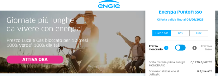 Una delle proposte più vantaggiose è Energia PuntoFisso di Engie, che si distingue per il fatto di non avere costi di attivazione, non richiedere il cambio del contatore, né interventi in casa, garantendo al contempo la continuità della fornitura. Questa offerta è disponibile per chi sottoscrive il contratto entro il 4 giugno 2025. Vediamo nel dettaglio come si articola l’offerta in questione.