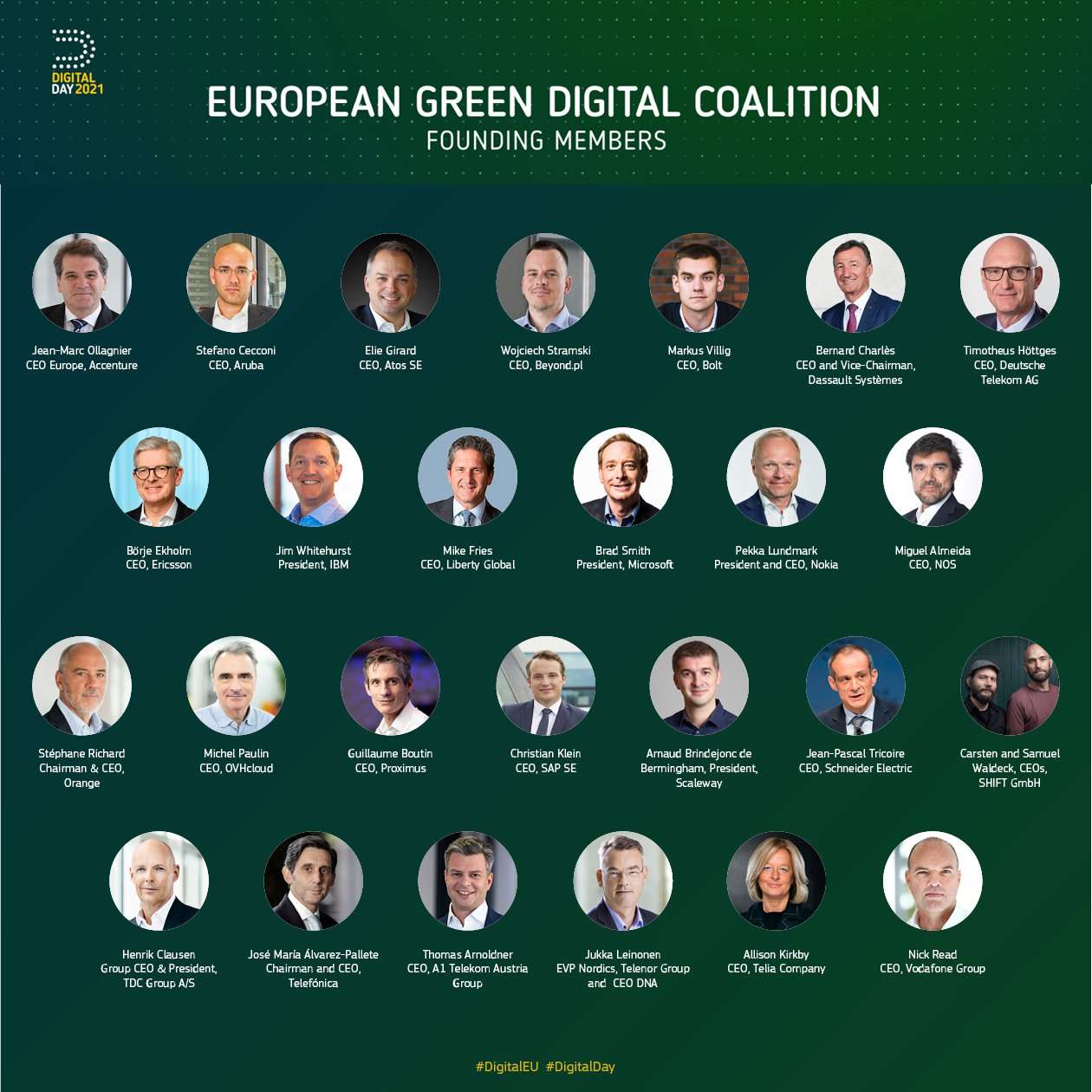 Tra i firmatari, oltre a Stefano Cecconi per l’italiana Aruba, si segnalano i CEO Accenture, Deutsche Telekom, IBM, Ericsson, Microsoft, Nokia, Orange, OVHcloud, SAP, Schneider Electric e Vodafone.