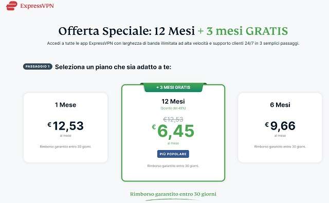 L’offerta speciale di ExpressVPN propone il piano di 1 anno a 6,45 euro al mese, per effetto dello sconto del 49% sul prezzo di listino, pari a 12,53 euro. In più offre 3 mesi di servizio aggiuntivi in regalo, in aggiunta a un rimborso garantito entro 30 giorni dall’attivazione. È possibile pagare con American Express, Visa, Mastercard, Postepay, PayPal e Bitcoin. Una volta completato l’ordine, ricevi un supporto clienti attivo 24 ore su 24, 7 giorni su 7, tramite chat dal vivo.