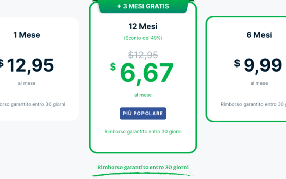 ExpressVPN offre una promozione imperdibile: abbonandoti per 12 mesi, riceverai 3 mesi extra gratuiti! Questo piano annuale è il più popolare, grazie a un incredibile sconto del 49%, che porta il costo mensile a soli $6,67, invece dei $12,95 mensili del piano mensile. Tutti i piani includono una garanzia di rimborso entro 30 giorni, permettendoti di provare il servizio senza rischi.
