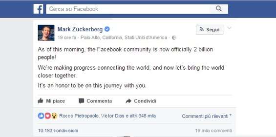 C’è aria di festeggiamenti in casa Facebook. Dopo i dati di crescita di fatturato più che positivi delle ultime trimestrali , è ora di brindare ad un altro grande traguardo: i 2 miliardi di utenti registrati . Ad annunciarlo è direttamente Mark Zuckerberg nel suo profilo , accompagnando l’esultanza con un video creato appositamente per ringraziare gli utenti del social network.
