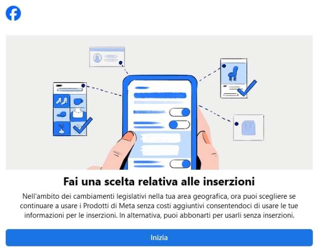 Questa è invece la schermata mostrata se l’utente sceglie di usare Facebook senza abbonamento e quindi con la pubblicità personalizzata: