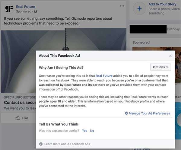 Il test condotto da Gizmodo lo dimostra in modo diretto. L’autore dell’articolo (Kashmir Hill) è stato in grado di far sì che un contenuto sponsorizzato di Real Future comparisse sullo schermo di un ricercatore della Northeastern University (Alan Mislove) fornendo a Facebook il numero di telefono di linea fissa dell’ufficio di quest’ultimo. Un dato che Mislove non aveva mai indicato al social attraverso il proprio account. Sono trascorse solo alcune ore dall’input del numero alla visualizzazione della pubblicità. La spiegazione di quanto accaduto è racchiusa nella comunicazione mostrata dalla piattaforma stessa.