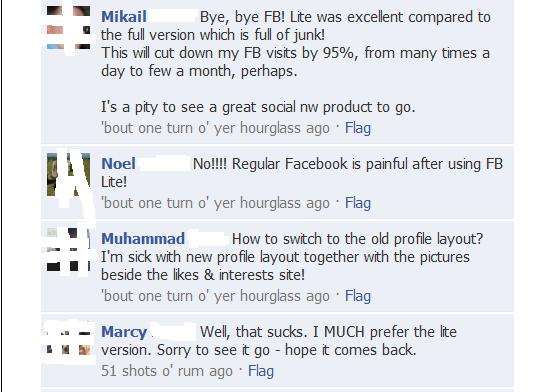Chi fra i 400 milioni di utenti Facebook si era affezionato alla versione Lite, per certi aspetti molto simile a Twitter, verrà presto reindirizzato alla homepage canonica, notoriamente ingorda di banda. C’è chi si chiede dunque se Facebook intende fornire un’alternativa per coloro i quali si erano avvalsi di questa opportunità proprio per la sua “leggerezza”, ma al momento da Palo Alto non viene chiarito nulla.