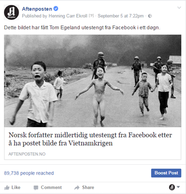 A richiamare ulteriormente l’attenzione sull’ opera di moderazione di Facebook è stato il caporedattore di Aftenposten Espen Egil Hansen, in una lettera aperta indirizzata a Mark Zuckerberg e ai cittadini della Rete: a seguito della rimozione imposta allo scrittore, in seguito alla notizia pubblicata dalla testata, nel giro di 24 ore Facebook ha chiesto la rimozione dell’immagine alla testata e ha provveduto alla cancellazione d’ufficio.