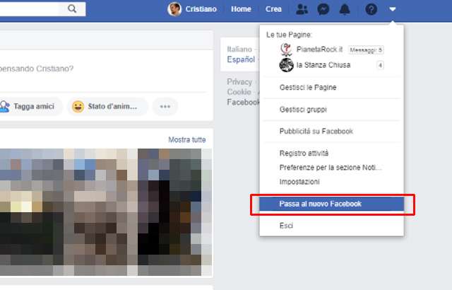 È sufficiente fare click sul pulsante in alto a destra per aprire il menu a tendina e selezionare poi la voce “Passa al nuovo Facebook”, come mostrato dallo screenshot qui sotto.