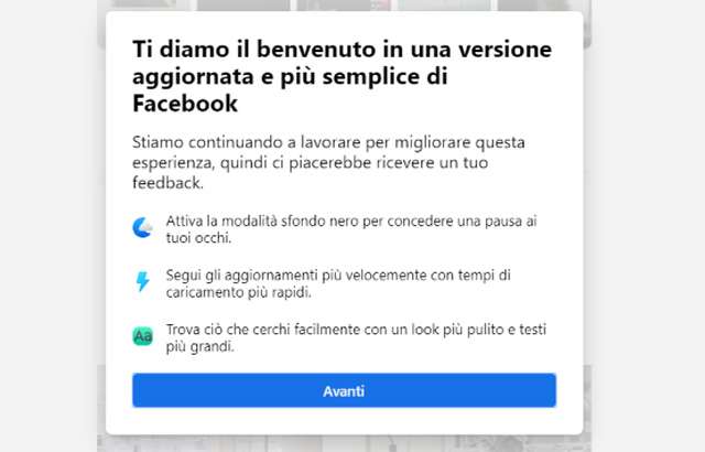 Ci si trova così di fronte a un messaggio di benvenuto che chiede all’utente di fornire feedback sul restyling, elencandone alcune delle caratteristiche.