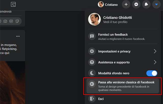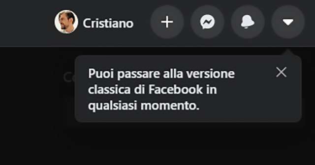 Un messaggio ricorda che è possibile tornare alla versione classica di Facebook, se lo di desidera.