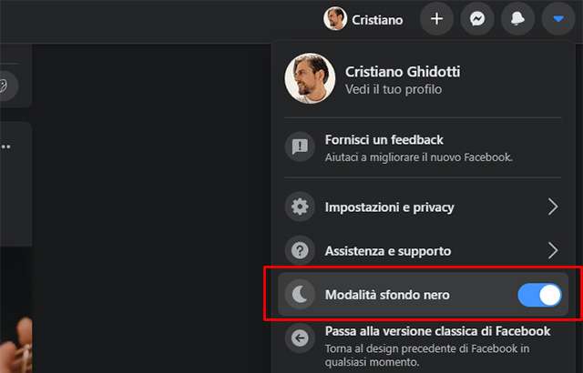Un altro click su “Modalità sfondo nero” attiva e disattiva invece il tema scuro per l’interfaccia.