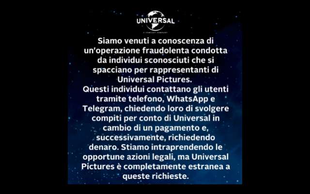 Il post continua: “Questi individui contattano gli utenti tramite telefono, WhatsApp e Telegram, chiedendo loro di svolgere compiti per conto di Universal in cambio di un pagamento e, successivamente, richiedendo denaro. Stiamo intraprendendo le opportune azioni legali, ma Universal Pictures è completamente estranea a queste richieste“.