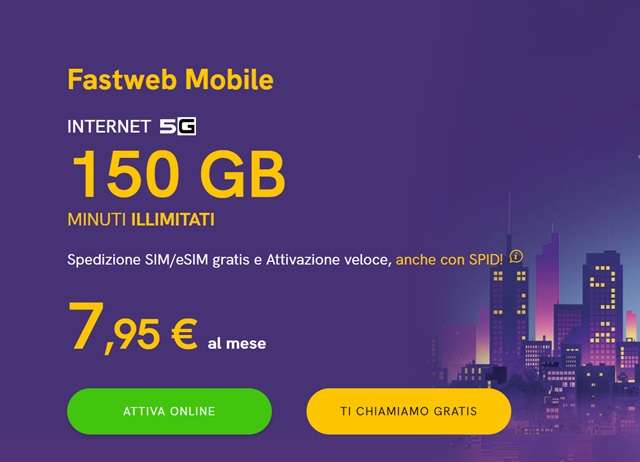 Fastweb Mobile, premiata per la quarta volta da Ookla come la rete mobile più veloce d’Italia, è in offerta a 7,95 euro al mese. La promozione include 150 Giga (anche in 5G), minuti illimitati verso fissi e mobili nazionali, 100 SMS e la spedizione della SIM o eSIM gratis. A tutto questo si aggiunge anche l’accesso ai corsi della Fastweb Digital Academy per ottenere maggiori competenze in questo settore.