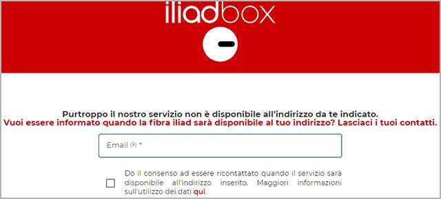 Se la rete su cui poggia la fibra Iliad ancora non raggiunge il domicilio è possibile lasciare l’indirizzo email. Si verrà così contattati non appena la situazione cambierà.