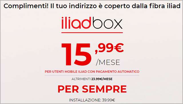 È chiesto un contributo da 39,99 euro per l’installazione, da versare solo una volta in seguito alla sottoscrizione del contratto. È inoltre prevista la fornitura del dispositivo Iliadbox in comodato d’uso gratuito. Nella spesa è inclusa la possibilità di effettuare chiamate senza limiti verso tutti i numeri fissi e mobili nazionali oltre che verso oltre 60 destinazioni internazionali.