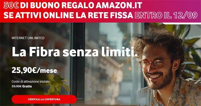 La fibra ultraveloce di Vodafone, che può arrivare fino a 2,5 Gigabit/s (verifica la copertura) è in offerta oggi a soli 25,90 euro al mese. I vantaggi non finiscono qui: grazie alla promozione che scadrà tra poche ore, puoi avere anche l’attivazione gratuita, il modem incluso e un buono regalo Amazon da 50 euro che sari libero di spendere per i tuoi acquisti sull’e-commerce.