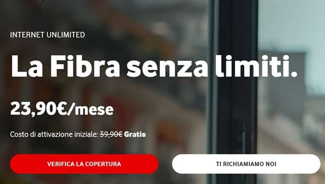 Fino al 31 ottobre la fibra di Vodafone è in offerta a 23,90 euro al mese. La promozione Internet Unlimited è valida solo online e non prevede costi di attivazione, che di solito corrispondono a 39,90 euro. Inoltre, sono disponibili anche chiamate senza limiti.