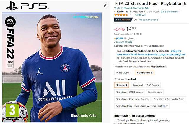 In anticipo rispetto all’inizio della Settimana del Black Friday (dal 18 al 28 novembre), spunta su Amazon un affare dedicato agli amanti delle simulazioni calcistiche: FIFA 22 per PS5a 14,97 euro su Amazon. Con uno sconto del 64%, il titolo è disponibile immediatamente e con spedizione gratuita per gli abbonati Prime.