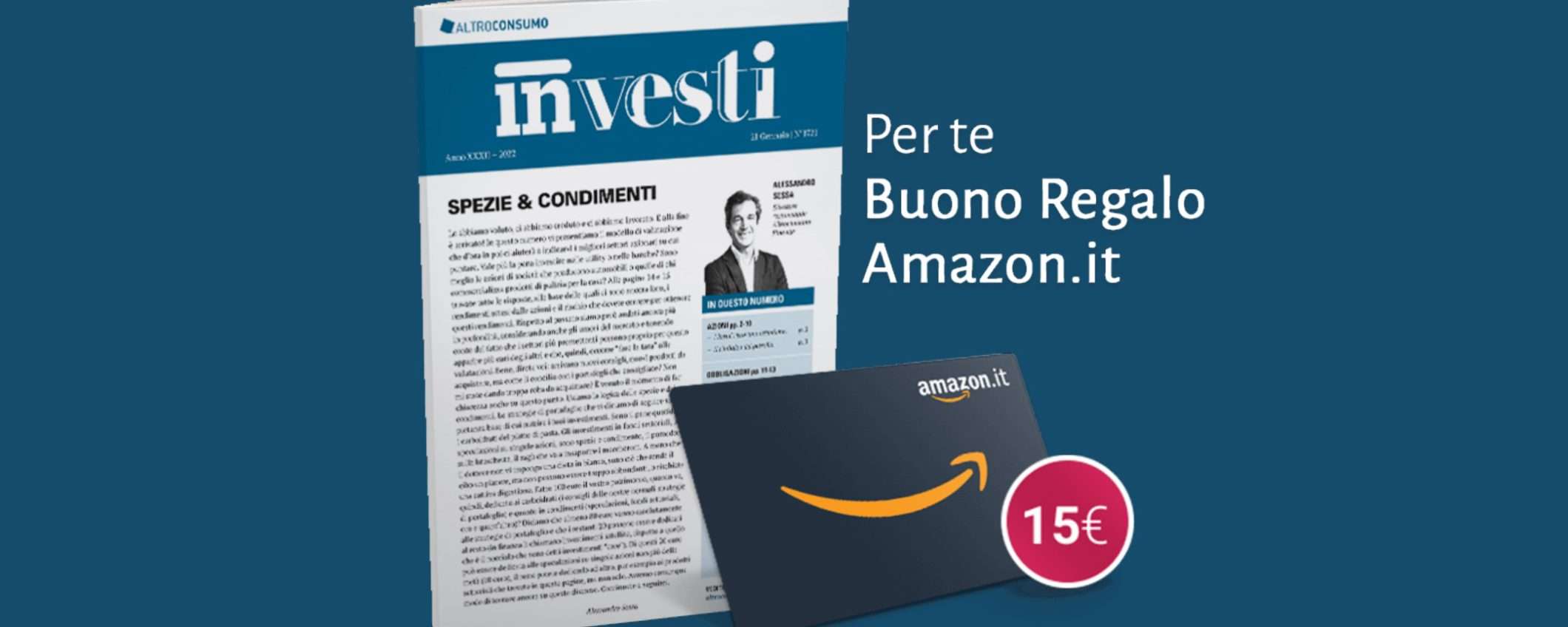 Per ricevere il buono, dovrai innanzitutto registrarti ad Altroconsumo Investi: il primo mese è completamente gratis, per permetterti di scoprire e testare tutte le funzionalità. Al termine del periodo gratuito di prova, per i primi 12 mesi pagherai una tariffa scontata del 50% di 12,82 euro al mese anziché 25,63 euro. Il regalo di benvenuto, ossia un buono Amazon da 15 euro, ti verrà inviato dopo l’avvenuto pagamento della prima quota scontata. È possibile disdire il piano in qualsiasi momento, senza costi aggiuntivi.
