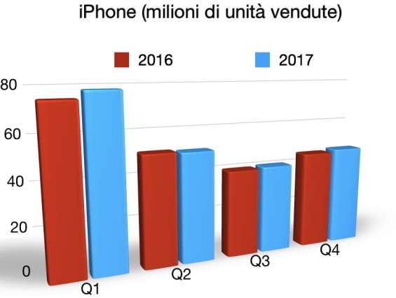 Ma partiamo dal principio o, ancora meglio, andiamo ad esaminare cos’è successo per ogni singolo prodotto o settore , partendo da quello che ormai è il prodotto simbolo della casa della mela: l’ iPhone . Il 2017 si prevedeva come un anno difficile per il melafonino, con un modello, l’ iPhone 7 , esteticamente identico alle due serie precedenti, l’attesa di un modello innovativo per celebrare il decimo anniversario , e un mercato sempre più difficile e concorrenziale, soprattutto sul fronte cinese, dove Apple stava già scontando lo scotto del boom del 2015 (evento sicuramente positivo ma che era impensabile potesse ripetersi con gli stessi numeri negli anni successivi). Nonostante tutte queste incertezze, iPhone riuscì a registrare un incremento del 4,7 percento di unità vendute nello scorso trimestre natalizio, per poi subire una piccola battuta d’arresto nel trimestre successivo, prima di tornare a crescere (anche più di ogni previsione) negli ultimi due trimestri fiscali del 2017.