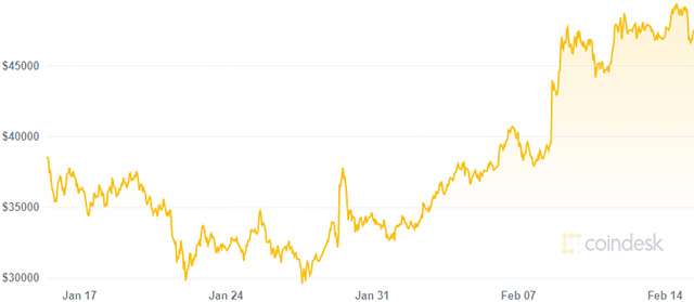Ampliamo il periodo esaminato per comprendere quanto sia stata significativa la crescita di Bitcoin nel corso dell’ultima settimana. A spingerla anche l’investimento da 1,5 miliardi di dollari annunciato da Tesla che a molti ha fatto storcere il naso per via di questioni legate alla sostenibilità.