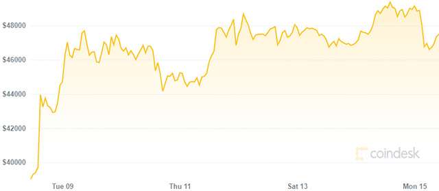 È accaduto ieri, mentre stanotte l’ennesimo tonfo come spesso accade dopo una crescita repentina e importante, tanto da arrivare a poco più di 46.300 dollari. Nel momento in cui viene scritto e pubblicato questo articolo BTC è scambiato a 47.563,58 dollari. Di seguito il grafico che fotografa l’andamento nelle ultime 24 ore.