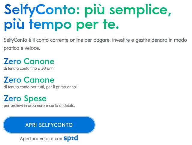 Se stavi cercando un conto corrente online conveniente, flessibile e ricco di vantaggi, adesso l’hai trovato. SelfyConto di Mediolanum non ha eguali attualmente nel settore bancario. Il canone zero per tutti e in offerta speciale per gli Under 30, insieme a tutti gli altri vantaggi, rendono questo conto il mezzo finanziario migliore per gestire il tuo denaro. Che aspetti? Apri il tuo conto oggi stesso!
