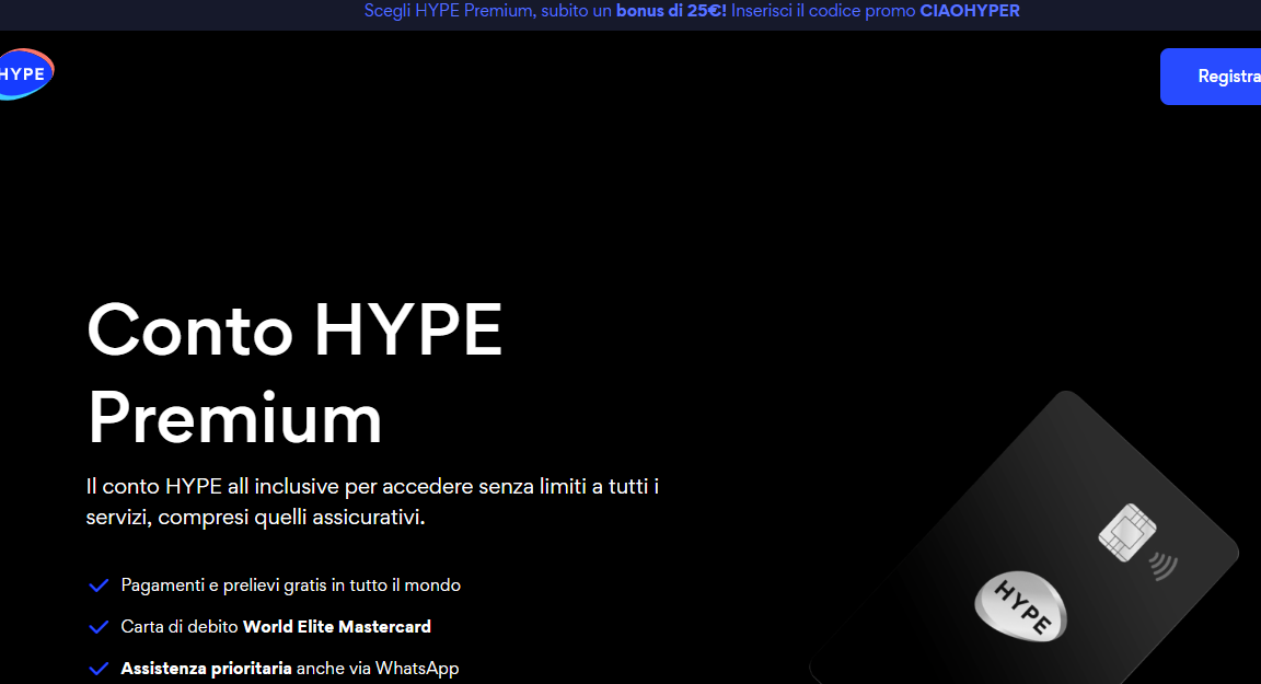 Pensavi che fosse tutto? No, perché HYPE è anche innovazione continua: nuovi servizi e funzionalità per rendere ogni tuo spostamento un’avventura senza stress. Tre carte conti: Base, Next e Premium. Quest’ultima, con un canone di 9,90 euro al mese, è la migliore perché ci sono prelievi gratuiti illimitati, cashback del 10%, un’assicurazione viaggio completa, assistenza prioritaria e un bonus di benvenuto di 25 euro.