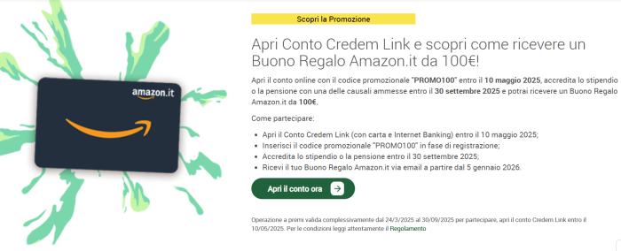 Per accedere al premio basta rispettare alcune condizioni: la prima è quella di aprire il conto Credem Link direttamente online, poi accreditare lo stipendio o la pensione, oppure utilizzare la carta di debito per pagamenti pari ad almeno 2.000€ complessivi entro il 31 dicembre 2025. Il buono Amazon verrà inviato via email entro il 28 febbraio 2026.