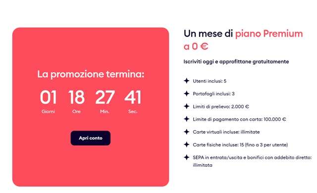 Fino a questo sabato sarà possibile approfittare di un mese di prova gratuita del piano Premium, che include 5 utenti, 3 portafogli e bonifici SEPA in entrata e in uscita illimitati. Sono illimitate anche le carte virtuali incluse, mentre sono disponibili 15 carte fisiche (fino a 3 per utente).