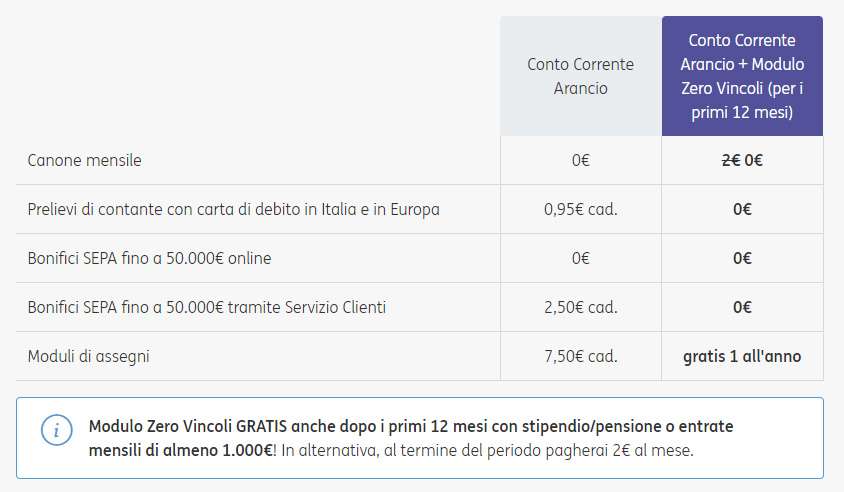 Una delle caratteristiche più allettanti del Conto Corrente Arancio è il canone gratuito per il primo anno. Se decidi di accreditare lo stipendio o la pensione (o comunque somme di almeno 1.000 euro) sul tuo Conto Corrente Arancio, il canone resterà zero anche dopo il periodo promozionale di dodici mesi. In alternativa, il costo è di soli 2 euro al mese.