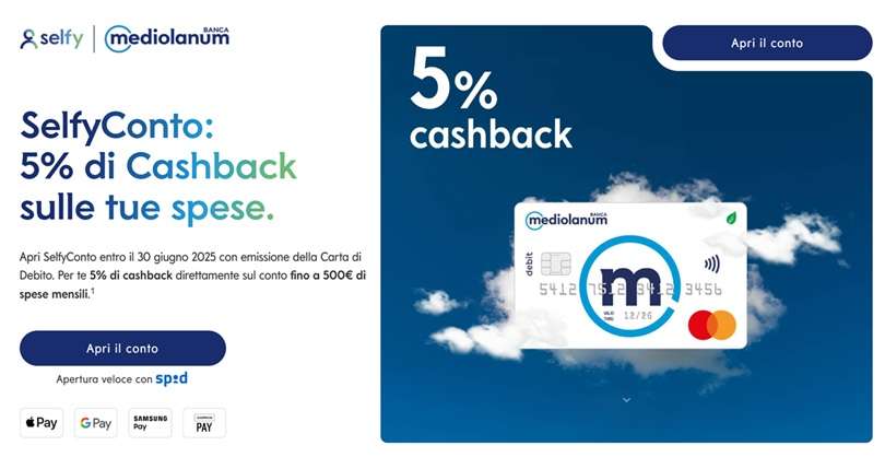 Se si vuole ottenere un rimborso sulle spese mensili, una soluzione interessante è quella proposta dai conti online con cashback. Uno dei più interessanti è SelfyConto, il conto corrente online di Banca Mediolanum, che nell’ambito dell’ultima iniziativa della banca meneghina offre il 5% di cashback ai nuovi clienti che aprono il conto entro il 30 giugno 2025.