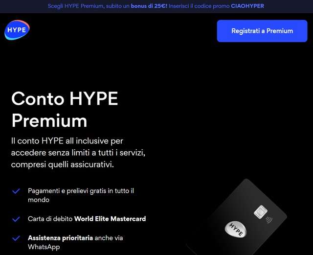 HYPE è un conto a canone zero che consente di gestire le proprie spese quotidiane al meglio. Il piano più completo è HYPE Premium, che consente di ottenere subito un bonus di 25 euro inserendo il codice promo CIAOHYPER.